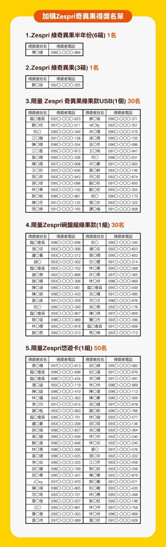 - 五獎:Zespri悠遊卡,共100名。(單月抽出50名)